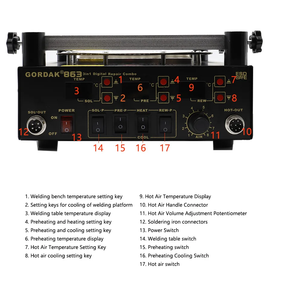 Product Name: Gordak 863 3 In 1 Solder Station Multifunction Digital Display BGA Rework Electric Iron Preheating Board Repair Hot Heat Air Gun