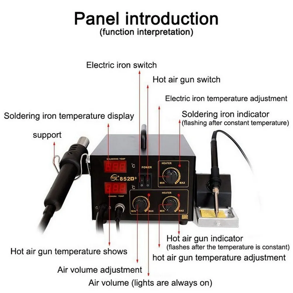 Product Name: 852 Hot Air Soldering Station Adjustable Thermostatic Soldering Station Digital Display Gun Heat Gun Welding Station Hot Sale